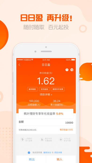 轻松理财赚钱的客户端应用,枫叶理财手机版活期理财随存随取,让你理财更安心,并且依靠国资背景,实时为你推荐优质产品。