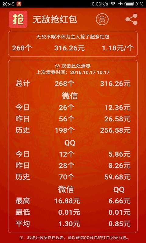 全网唯一支持红包金额、个数统计。今日,昨日,历史抢到红包个数、金额,一目了然,随时分享战果,嗨翻天;