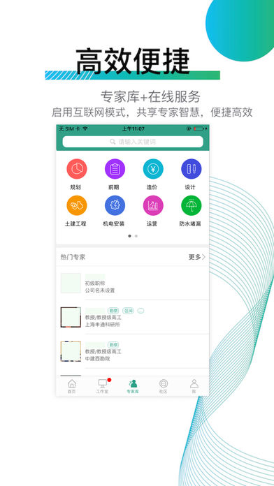 1、专家库:致力于汇聚国内工程行业规划、建设、运营等多领域的专家,利用互联网及移动互联技术,打造行业云智库;