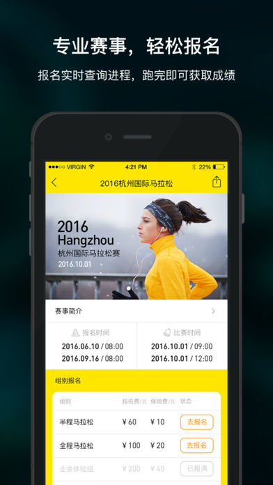 3、赛事:随时随地报名全国各地赛事,实时跟踪赛事进度;