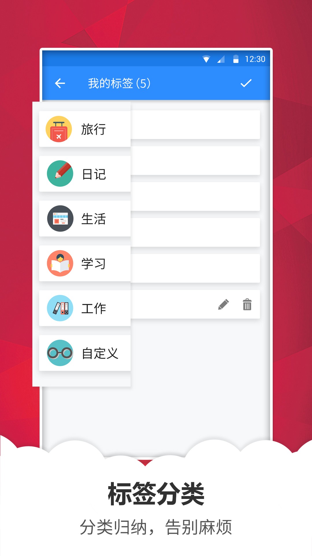 快记备忘录是专为重要事项提供的备忘记录工具,这里能编辑和添加新的备忘录,自定义编辑信息,还可添加提醒的时间,根据提醒,就能够看到需要解决的事情了,自由设定提醒的次数以及提醒的方式,进入音乐库,选择合适的音乐,一键设置就能够设置成为备忘录;还能将备忘录进行分组,生活、工作以及学习五分开来,就能够更好的区分备忘录,让行驶不再复杂繁琐,同时还能够将代办的事项显示在锁屏界面,从而达到备忘的作用和效果,便于极速完成待办事项。