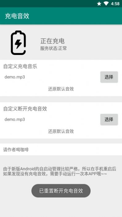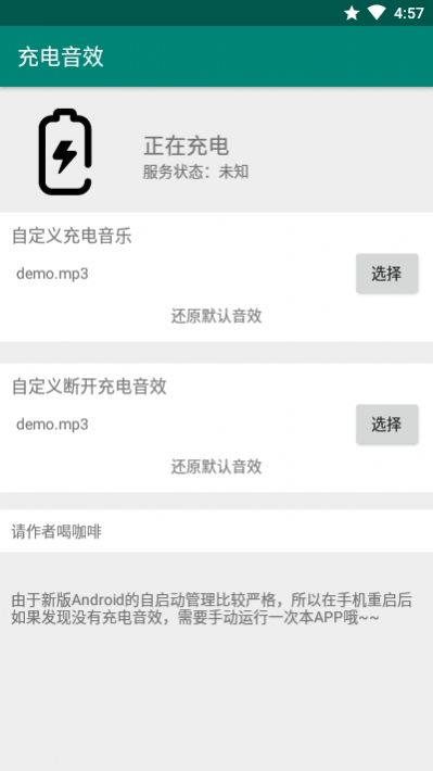 充电音效app是专门为用户打造的一款非常优质的充电音效的工具,充电音效app可以修改你们的充电声音提示音,还可以让你自定义通知消息和短信提示音还有铃声,为用户提供非常专业的充电音效的工具,喜欢的快来下载吧。