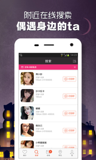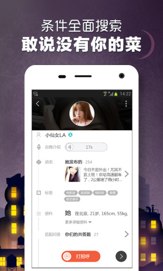 3、一键招呼,向心仪的ta表达好感,随时随地帮助单身的你发现身边适合你的人;