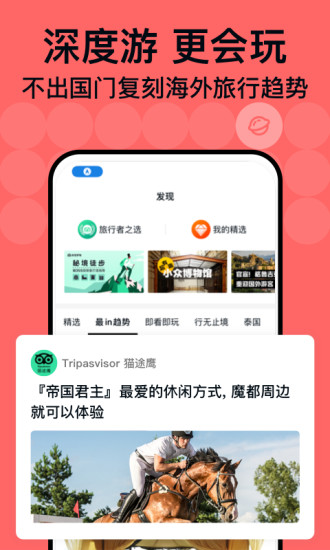 《TripAdvisor猫途鹰》是一款为用户们旅途出行打造的服务软件,软件覆盖范围大,服务项目多,用户通过软件能享受到最新的旅游景点的推送,让你实时了解各个时节的最好去处,享受旅游的快感,同时,软件支持线衫酒店的预订,需要的朋友记得下载TripAdvisor猫途鹰。