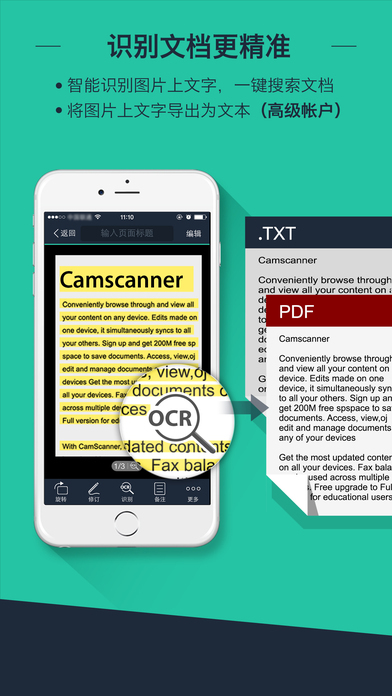 1、手机拍文档,自动去除杂乱背景,生成高清JPEG图片或PDF文件。