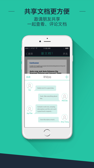 【文档共享、高效协作】随手扫描的任何文档,都可邀请朋友、同事为协作人,共同查看、评论文档。还可通过邮件、链接、或微博、微信等社交帐户分享给朋友。
