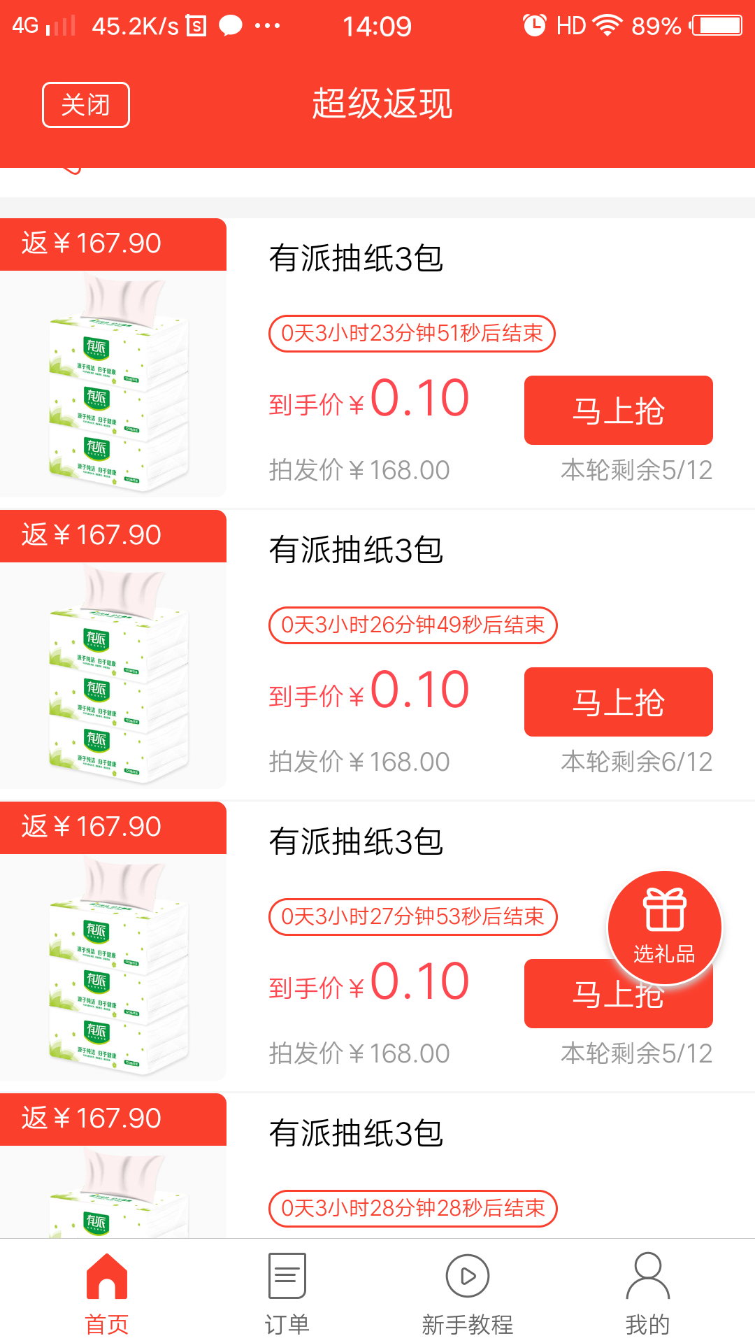 淘宝号通过审核之后到首页点击选礼品就可以看到0一毛钱的礼品,基本是3包抽纸呀,一些零食之类的东西。