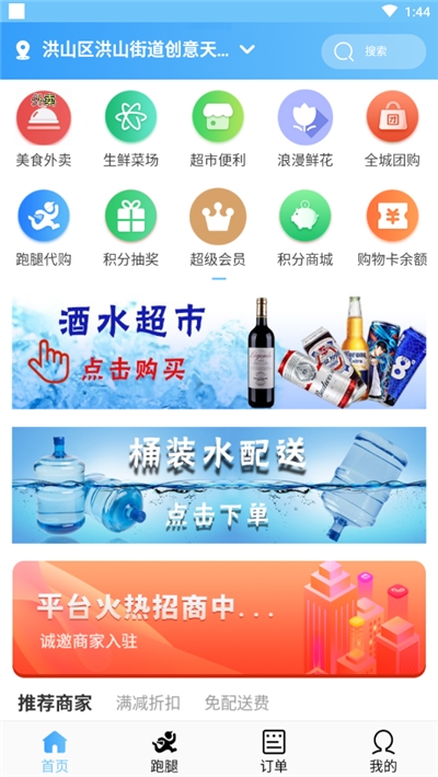 2、可以在酒水超市进行购买,还可以预定桶装水配送,实时定位所在位置进行多方面便民服务。