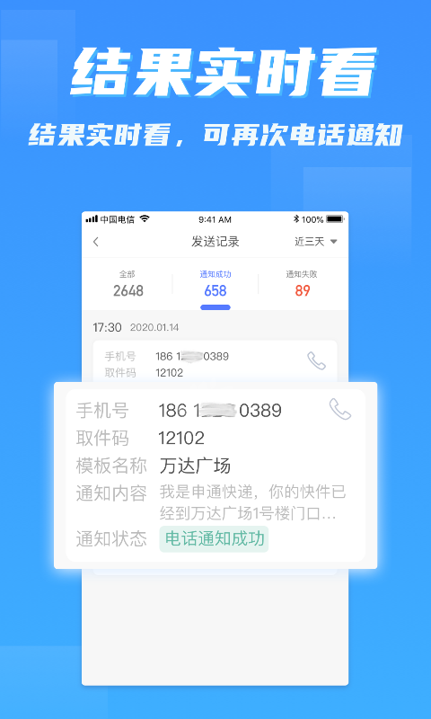 6、支持以韵达快递、申通快递、圆通快递、中通快递、百世快递、天天快递、邮政快递、顺丰快递、菜鸟驿站等数十家快递公司名义发送取件通知;