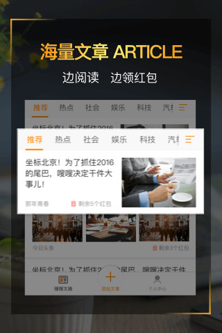 共享资讯功能,用户可以在文章中插入广告、内容编辑等操作,转发和阅读都可以领取红包奖励;