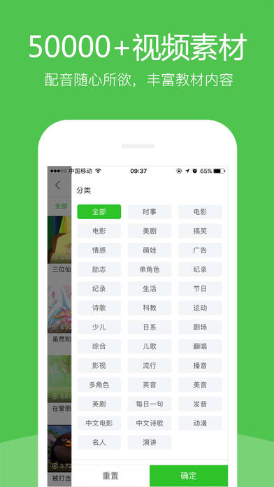 1、素材丰富:火爆的国际电影大片、最喜欢的英文歌、追了很久的动漫、英美剧,多类型丰富的视频素材,应有尽有!离线配音、离线合成,随时随地玩转配音;