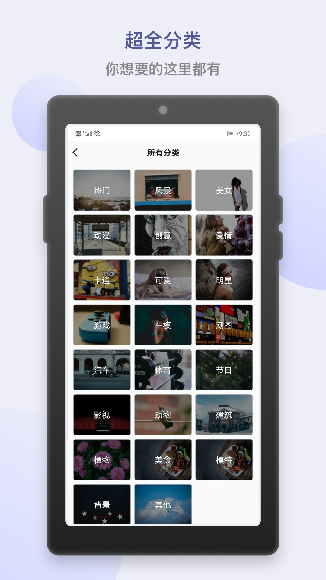 超全分类,个性主题。热门、风景、创意、汽车、体育、美食等20多种分类的静态壁纸,以及卡通、游戏、爱情等多个主题的动态壁纸供您选择
