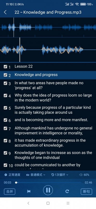 整个听力练习过程以示波图为主。音视频文件和每个断句都有相应的波形显示,方便您选择重复间隔和进行部分按键重复。
